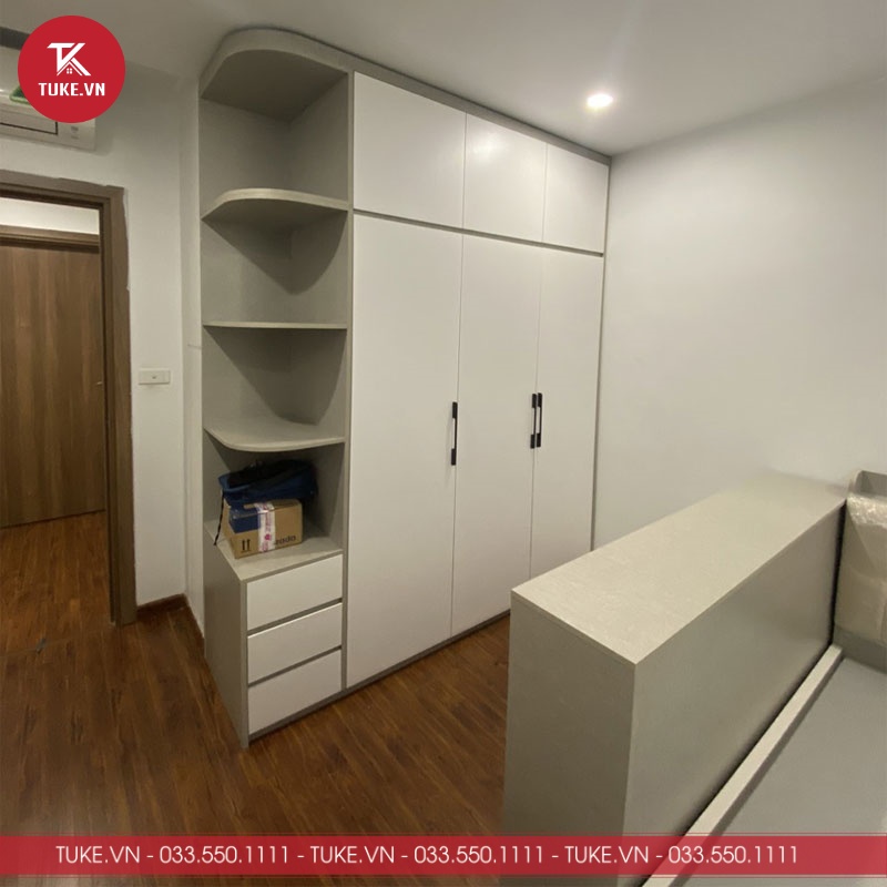 Để lắp đặt chiếc tủ đựng quần áo ở ngay chỗ cửa ra vào phòng ngủ theo yêu cầu của chị Ly, nhân viên của Tuke.vn đã đến đo đạc và tư vấn thiết kế mẫu tủ 3 cánh liền kệ kịch trần. Điều này giúp cho chiếc tủ có thêm nhiều không gian lưu trữ.  Ngoài cất gọn quần áo, tủ có thể để thêm được nhiều đồ dùng khác như chăn, ga, gối và nhiều vật dụng yêu thích để ở trên kệ. Kích thước tủ vừa phải và các ngăn thiết kế khoa học giúp quá trình cất và lấy đồ dễ dàng, thuận tiện.
